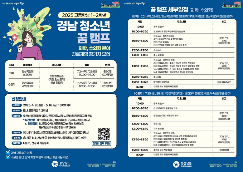 올해는 특히 학생들의 관심이 높은 테마를 편성하고 선배와의 현장 멘토링도 진행하는 등 선호를 반영해 프로그램을 개선했다. 꿈 캠프는 오는 16일까지 경남청년정보플랫폼(https://youth.gyeongnam.go.kr/youth/)이나 시군 청소년부서로 신청할 수 있다.