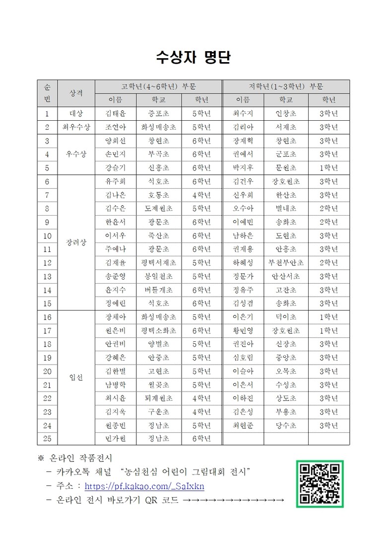 | ▲'농심천심(農心天心)경기도 어린이 그림 그리기 대회' 수상자 명단.(사진=경기농협) |