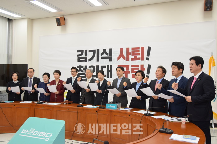 [세계타임즈 이영진 기자]김동철 원내대표 네. 오늘 경남현장최고위가 있는 관계로 많은 의원들이 참석하지 못했다만 어제 청와대의 행태는 도저히 묵과할 수 없는 일이기 때문에 오늘 이렇게 긴급 의원총회를 소집하게 됐다. 참석해 주신 의원들께 감사드린다.