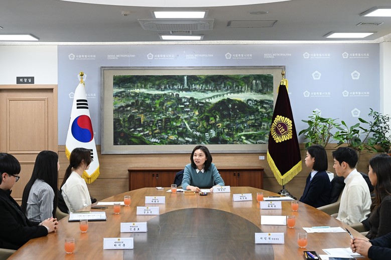 [서울 세계타임즈=이장성 기자] 서울특별시의회 최호정 의장(국민의힘, 서초4)은 26일(월) 의회 본관 의장접견실에서「제8기 겨울방학 대학생 인턴 간담회」를 개최하고, 청년들과 서울시 정책 현안, 일·가정 양립 고민 등을 주제로 진솔한 대화를 나눴다. 이번 간담회에는 대학생 인턴 7명이 참가했으며, 각자가 수행 중인 정책 연구 주제와 활동 소감을 공유했다.