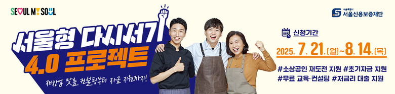 이번 2025년 하반기 참여 신청은 7월 21일(월)부터 8월 14일(목)까지 4주간 진행되며, 서울시 자영업지원센터 누리집(www.seoulsbdc.or.kr)을 통해 온라인 신청하거나, 가까운 서울신보 종합지원센터에서 방문 신청도 가능하다.