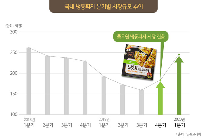 한편, 리서치회사 닐슨코리아에 의하면 국내 냉동피자 시장은 최근 급성장해 2018년 982억 원으로 정점을 찍었지만, 2019년 들어 27% 감소한 715억 원을 기록했다. 날로 성장하고 있는 국내 가정간편식 시장에서 냉동피자만 ‘역행’한 것이다.