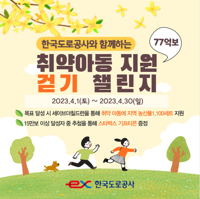 한국도로공사 관계자는 “사회적 거리두기 종료 이후 마스크 없이 즐기는 첫 봄 나들이 시즌에 맞춰 걷기 챌린지와 연계한 기부 프로그램을 준비했다”며, “앞으로도 취약계층에 대한 따뜻하고 든든한 나눔이 이어질 수 있도록 다양한 사회공헌활동을 발굴해 추진하겠다”고 말했다.