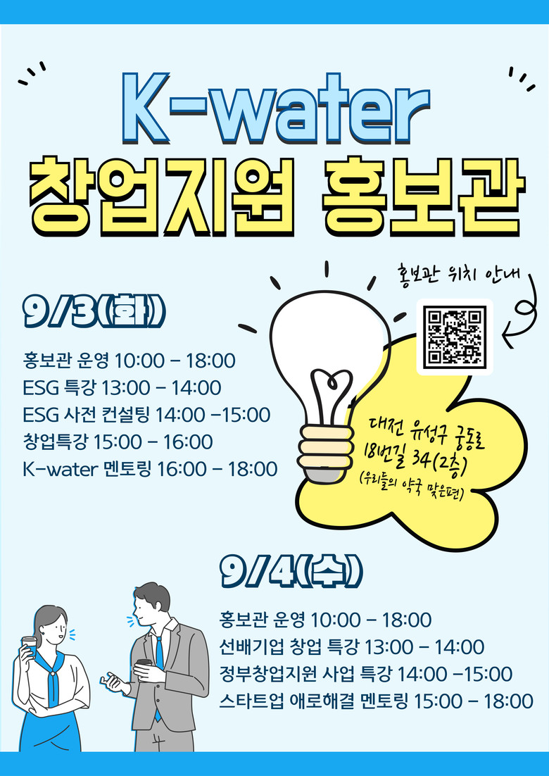 한국수자원공사는 9월 3일부터 4일까지 궁동로18번길 34, 2층에서 ‘K-water 창업지원 홍보관’을 열고 예비창업가 및 투자유치, ESG 경영전략이 필요한 창업기업을 대상으로 특강을 진행한다. 특강 외에도 정부와 한국수자원공사의 기업 지원제도를 소개하며 창업 전주기 성장 지원 전략을 홍보하고 참여형 이벤트 등을 통해 참여기업의 많은 관심을 유도할 계획이다.
