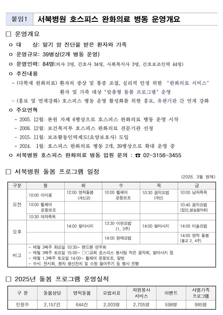 완화의료 병동 이용 관련 자세한 사항은 서북병원 호스피스 완화의료센터(☎02-3156-3455)로 문의하면 된다.