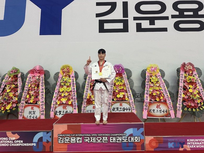 | ▲ 지난 5일부터 8일까지 부산광역시 기장실내체육관에서 ‘2025 김운용컵 국제오픈태권도대회’가 진행된 가운데 위력격파(옆차기/뒤차기격파) 종목에서 1위 및 MVP를 수상한 신천지 태권도 대표팀 공두현 선수가 기념촬영을 하고 있다. |