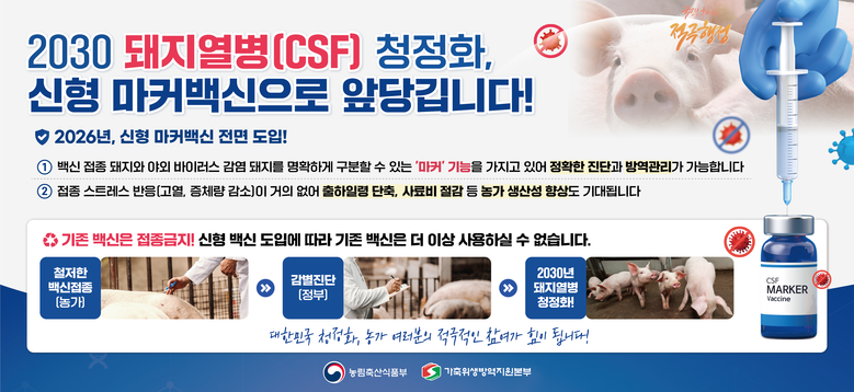 이번 백신 전환은 2030년 돼지열병 청정국 지위 확보를 목표로 한 국가 중장기 방역정책의 핵심 조치로, 야외바이러스 감염축과 백신 접종축을 구분할 수 있는 마커백신 도입을 통해 질병 발생 여부를 과학적으로 판별하고, 발생 시 신속한 대응이 가능하게 하기 위한 것이다.