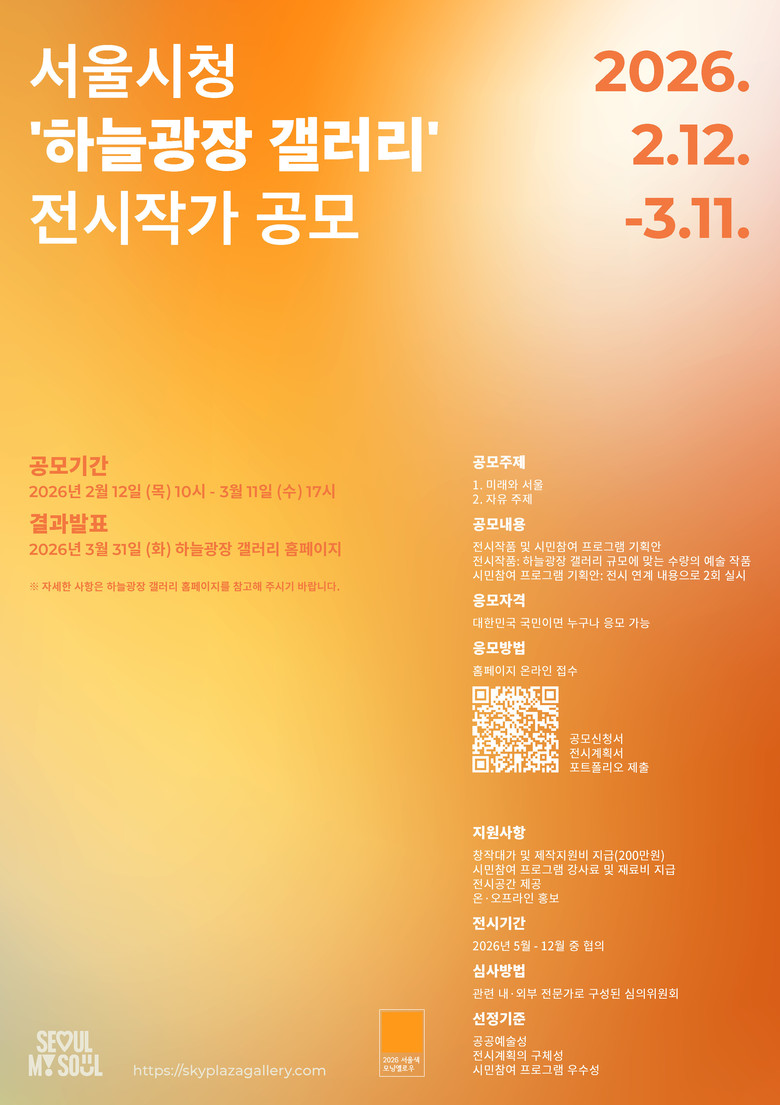 이번 공모는 연령 및 지역 제한 없이 대한민국 국민이면 누구나 참여할 수 있다. 접수 기간은 2월 12일(목) 10시부터 3월 11일(수) 17시까지로, 서울시청 ‘하늘광장 갤러리’ 누리집(www.skyplazagallery.com)에서 온라인으로 접수하면 된다.