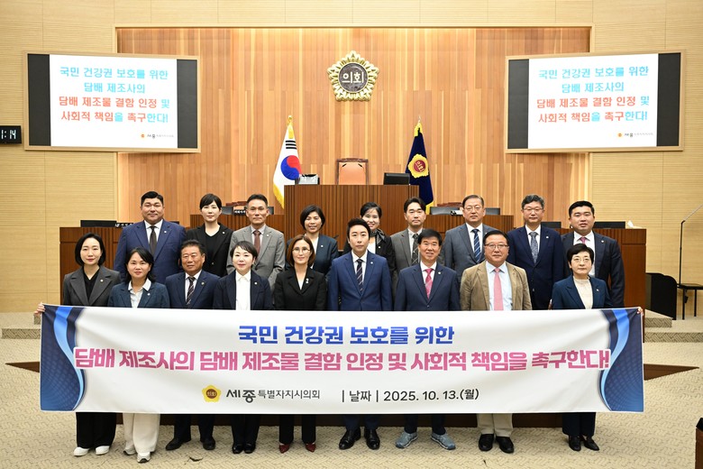 세종시의회는 이번 결의안을 통해 “담배 제조물의 결함과 기업의 책임을 명확히 시사해 국민의 생명과 건강을 보호하기 위한 제도적 기반을 강화해 나가겠다”고 밝혔다.