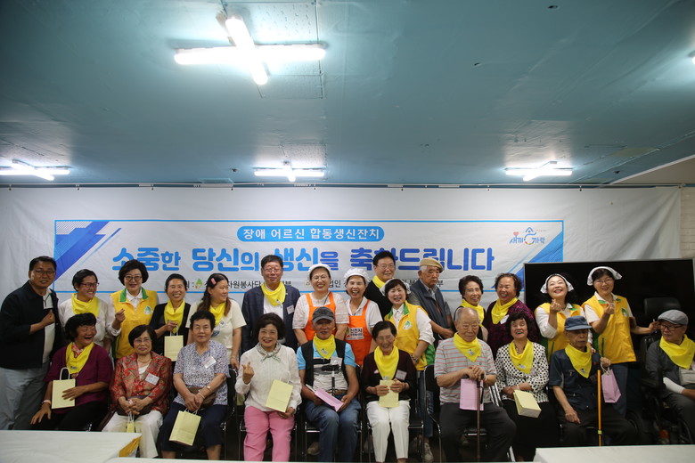| ▲ 합동생일잔치에 참여한 장애어르신들의 단체사진 [사진 제공 = 신천지자원봉사단 부천지부] |