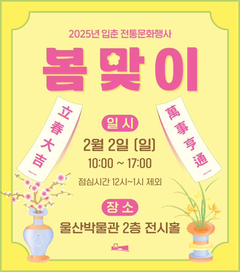 [세계타임즈=울산 이호근 기자] 울산박물관은 입춘(2월 3일)을 맞아 2월 2일(일) ‘봄맞이’ 입춘 전통 문화행사를 운영한다고 밝혔다.
