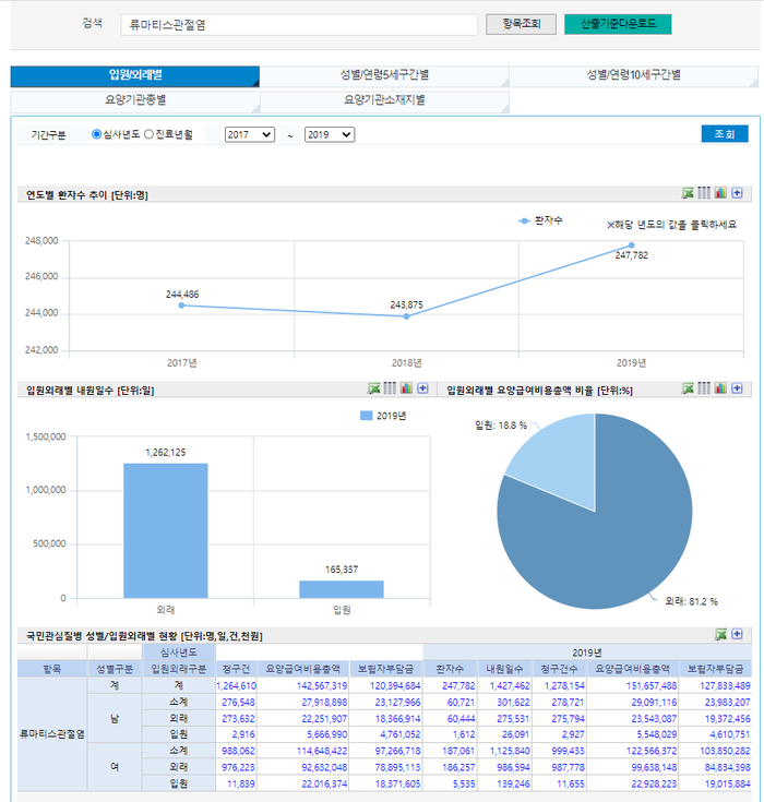 건강보험심사평가원에 따르면, 2019년 류마티스 관절염 환자수는 247,782명으로, 남성(60,721명)에 비해 여성은 187,061명으로 여성이 3배 이상으로 많이 앓고 있는 질환이다. 2019년 연령구간별 요양급여비용총액 비율로 살펴보면 60대 27.3%, 70대 18.4%, 50대 25.2%, 40대 14.1%, 30대 5.9%, 20대 2.2% 순으로 나타났다.