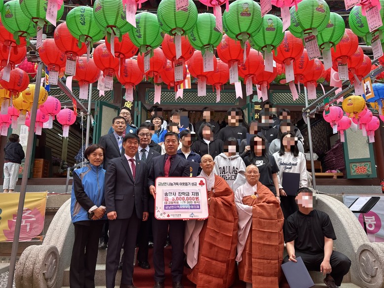 [세종 세계타임즈=이채봉 기자] 세종특별자치시 금남면 송림사(주지 혜진스님)가 부처님 오신 날을 맞아 5일 금남면 취약계층 중·고등학생 10명에게 1인당 30만 원씩 장학금을 전달했다.