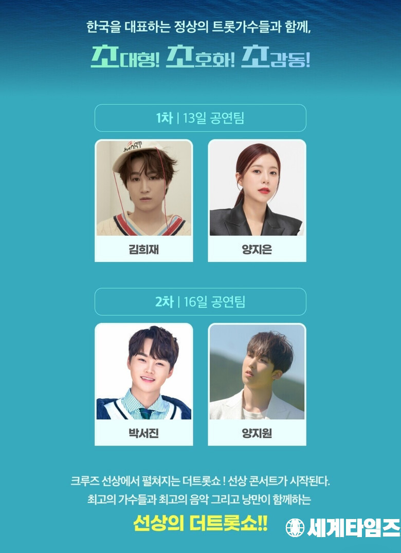첫날 13일에는 ‘더 트롯쇼’ MC이자 최근 뮤지컬 <4월은 너의 거짓말>에서 명품 연기를 선보이고 있는 김희재와 ‘미스트롯2’ 진에 빛나는 효녀 가수 양지은이 ‘선상의 더트롯쇼’의 화려한 막을 열 예정이다. 둘째 날 16일에는 막강한 트롯 팬덤 화력을 보유한 장구의 신 박서진과 트롯 신동에서 트롯 아이돌로 성장한 양지원이 참여해 팬들과 만날 예정이다. 이들은 크루즈 내 마련된 공연장에서 그간 볼 수 없었던 화려한 무대들을 선보이며 팬들과 함께 추억을 쌓을 계획이다.
