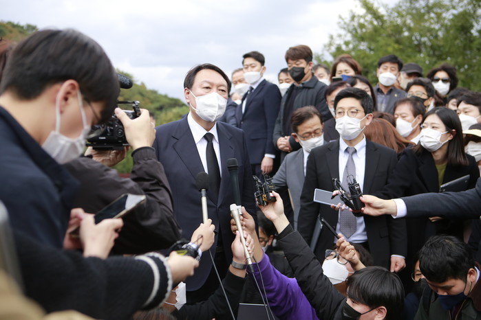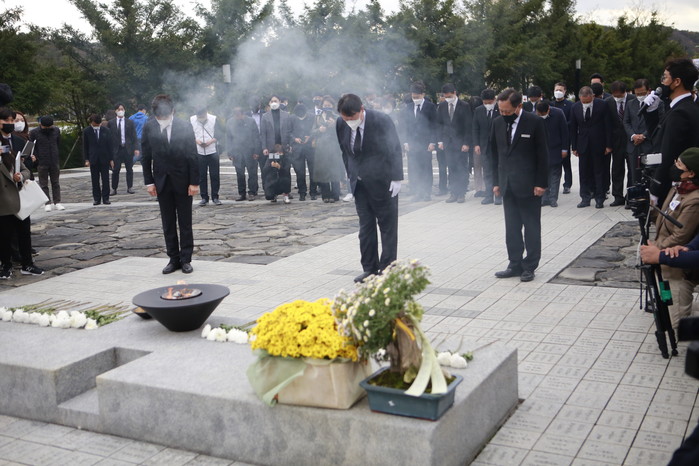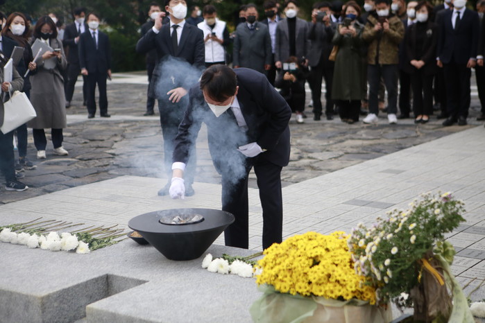 [세계타임즈 이진화 기자]윤석열 국민의힘 대선후보는 11일 오후 경남 김해 봉하마을에 고(故) 노무현 전 대통령 묘소를 을 참배한 뒤 "노 전 대통령의 정신을 발 배우겠다"고 밝혔다.