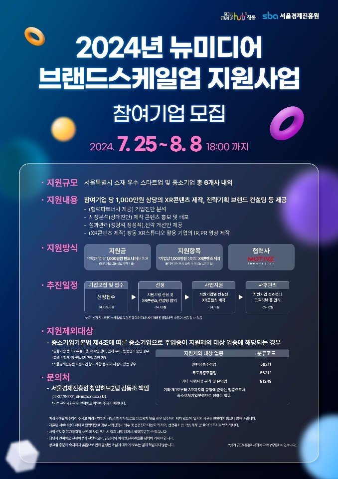 참가기업 모집은 8월 8일 금요일까지 서울스타트업플러스 서울창업허브 창동 홈페이지(hubchangdong.startup-plus.kr)에서 온라인 접수가 가능하다.