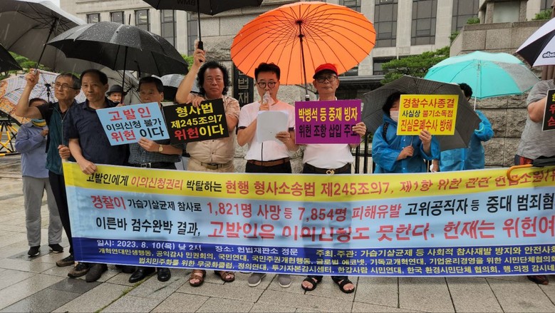[세계타임즈 백진욱 기자] 어제(8.10. 목) 낮 2시부터 약 30분 동안 종로구 계동에 있는 헌법재판소 정문 앞에서 강한 비바람이 몰아치는 날씨에도 ‘가습기살균제 등 사회적 참사재발 방지와 안전사회 건설 등을 위한 연대모임’(약칭: 안전사회건설연대모임) 등 총 17개 시민환경단체 대표와 회원 등 약 20여명이 현행 형사소송법 제245조의7 제1항이 고발인으로부터 이의신청권리를 박탈하는 위헌임을 확인해달라고 청구하는 헌법소원 제기하는 기자회견을 열었다.