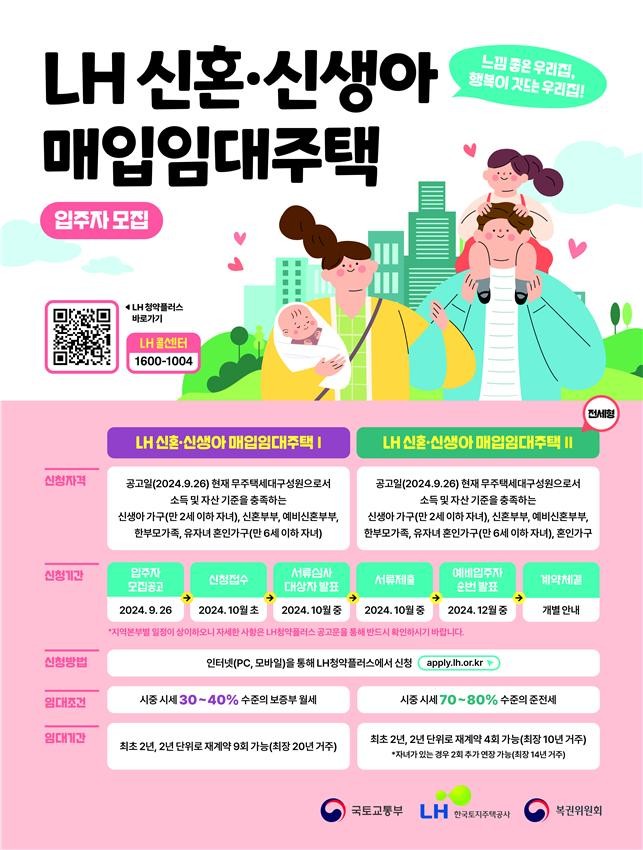‘신혼·신생아 매입임대주택’은 결혼 7년 이내 신혼부부, 예비신혼부부, 신생아가구* 등을 대상으로 공급하는 주택이다. 소득·자산기준 등에 따라 신혼·신생아Ⅰ,Ⅱ 유형으로 구분된다.
