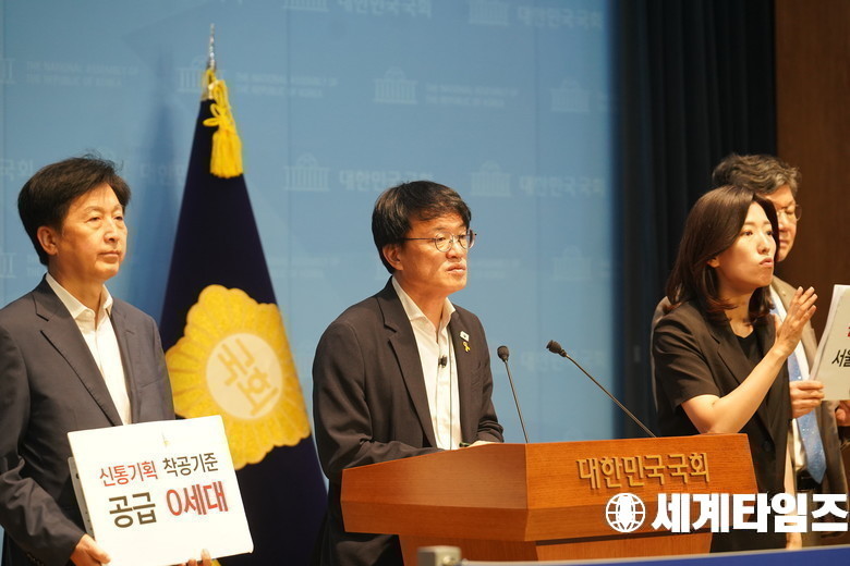 '박주민' 더불어민주당 의원이 9일 오전 서울 여의도 국회 소통관에서 오세훈 서울시장의 주택·부동산 정책을 규탄하는 기자회견을 하고 있다.