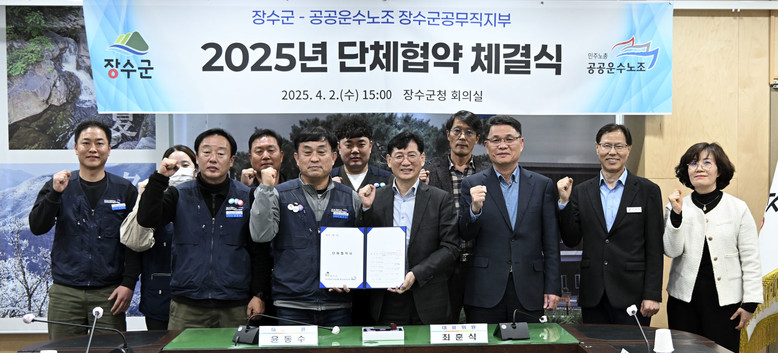 [장수 = 세계타임즈 김서주 기자] 장수군과 전국공공운수노조 장수군 공무 직지 부는 지난 2일 장수군청 회의실에서 ‘2025년 단체협약’을 체결했다.