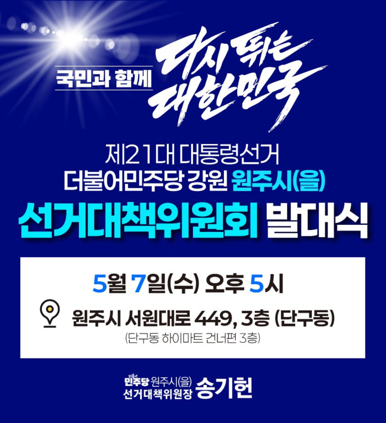 - 제21대 대통령선거 더불어민주당 강원 원주시(을) 선거대책위원회, 5월 7일 발대식 개최