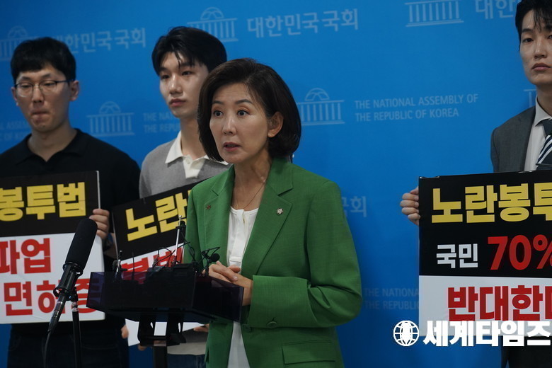국민의힘 '나경원' 의원과 노동개혁청년행동이 12일 서울 여의도 국회 소통관에서 기자회견을 열고 노란봉투법 폐지를 촉구하고 있다.
