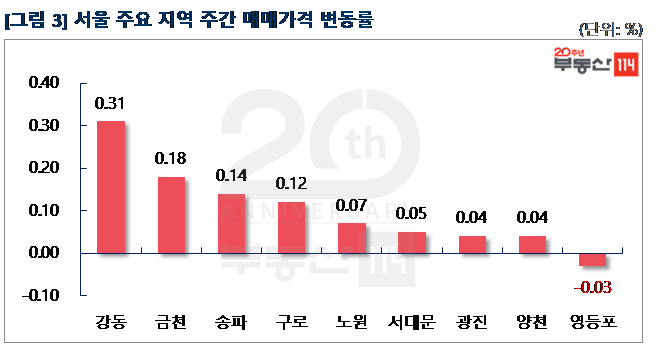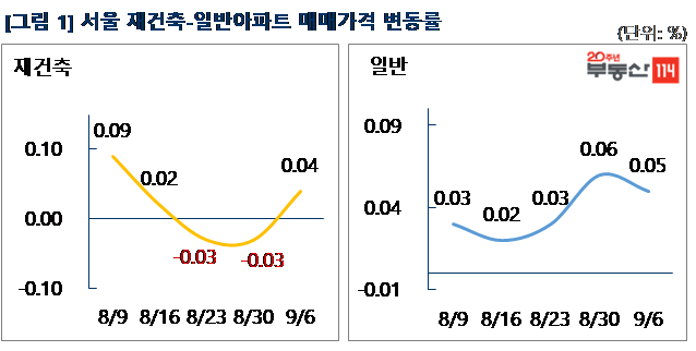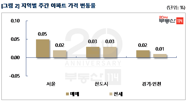부동산114(www.r114.com)에 따르면 금주 서울 아파트 가격은 0.05% 올라 지난주와 동일한 변동률을 기록했다. 재건축이 0.04% 오르면서 3주만에 상승 전환했고, 일반 아파트는 0.05% 올랐다. 신도시와 경기ㆍ인천은 각각 0.03%, 0.02% 올랐다.