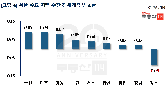 서울 전세가격은 가을 이사철을 맞아 △금천(0.09%) △마포(0.09%) △강동(0.08%) △노원(0.05%) △서초(0.04%) △양천(0.03%) 순으로 올랐다. 직주근접 실수요의 거래가 이어지면서 금천은 가산동 두산위브가 250만원-750만원 올랐고, 마포는 공덕동 래미안공덕1차와 상암동 월드컵파크2단지가 1,000만원-4,000만원 올랐다. 강동은 고덕동 고덕래미안힐스테이트와 명일동 삼익그린2차가 1,500만원-2,000만원 올랐다. 노원은 중계동 중앙하이츠, 양지대림2차, 한화꿈에그린 등이 500만원-2,000만원, 서초는 반포동 반포자이가 2,500만원 상승했다. 양천은 신정동 목동파크자이와 목동신시가지9단지가 500만원-1,000만원 올랐다. 반면 ▼강북(-0.09%)은 번동 솔그린, 해모로가 500만원-1,000만원 하락했다.