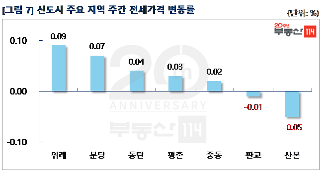 신도시는 △위례(0.09%) △분당(0.07%) △동탄(0.04%) △평촌(0.03%)이 올랐다. 위례는 매물 품귀가 나타난 학암동 위례롯데캐슬이 1,500만원 올랐다. 분당은 전세 수요가 늘면서 정자동 정든우성, 야탑동 장미동부와 장미현대 등이 500만원-1,000만원 상승했다. 동탄은 신동탄SK뷰파크2차, 동탄역더샵센트럴시티 등 신축 아파트 중심으로 500만원-1,000만원 올랐다. 반면 ▼산본(-0.05%), ▼판교(-0.01%)는 전주에 이어 내림세를 이어갔다.