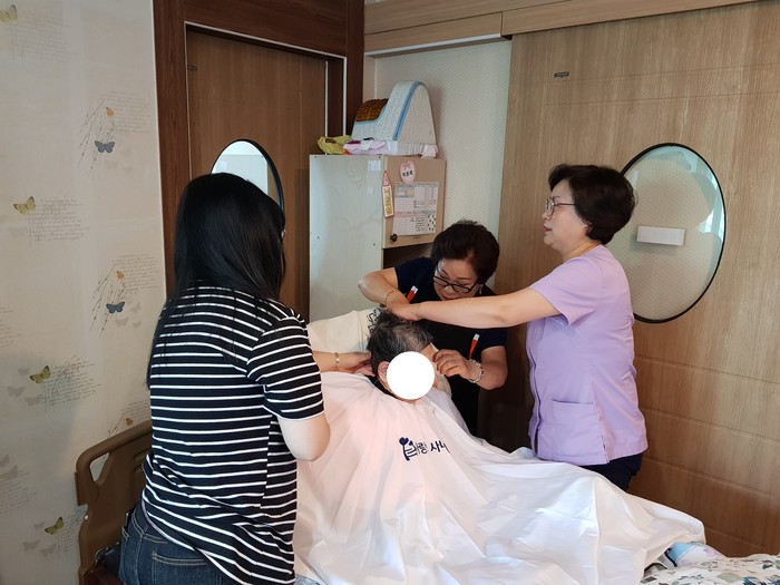 오정동 이순옥 헤어샆 원장은 “약 2시간동안 치매 어르신들을 위한 미용봉사가 쉬운 일은 아니지만, 부모님을 생각하면서 정성을 다해서 미용봉사를 했다.“고 말했다.