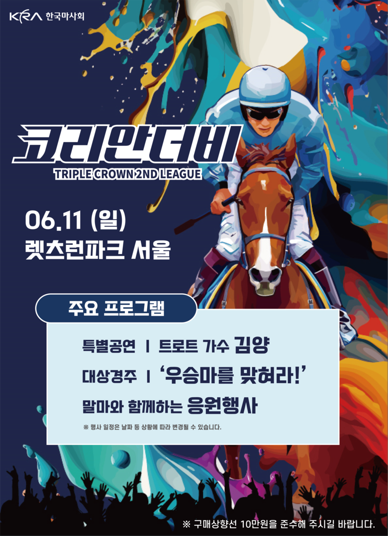 - 오는 11일에는 ‘코리안더비’ 대상경주 맞이 ‘이길랑 말(馬)랑 응원 페스티벌’ 등 다양한 이벤트가 풍성