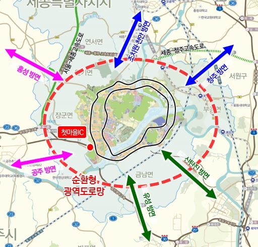 순환도로망에서 행복도시로의 접근성 향상을 위한 첫마을IC 설치, 그리고 인근 지자체 요청사업을 종합적으로 살펴 행복도시 광역교통체계가 ‘방사형’에서 ‘순환·격자형’ 광역도로망 구조로 변화시키는 방안을 검토한다.