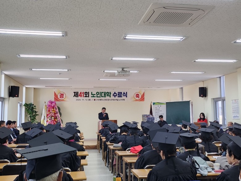 [장수 = 세계타임즈 김서주 기자] 대한노인회 전북 장수군지회(지회장 허기태)는 부설 노인대학(학장 홍봉길) ‘제41회 노인대학 수료식’이 12일 장수사회복지회관에서 성황리에 개최됐다고 전했다.