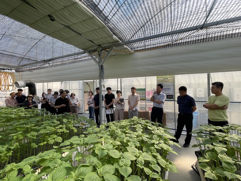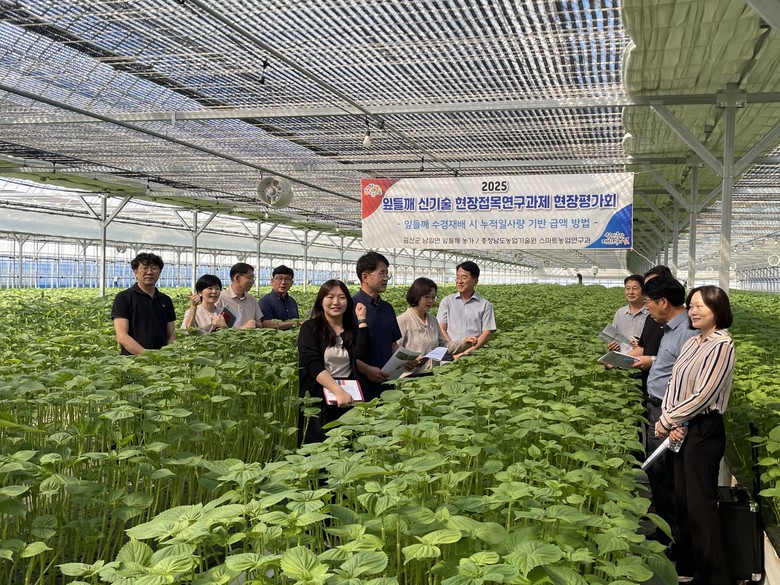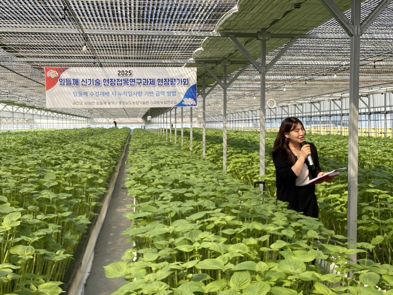 도 농업기술원은 1일 금산군 남일면 음대리 반석깻잎농장에서 잎들깨 재배농가와 연구·지도기관 관계자 등 50여 명이 참석한 가운데 ‘잎들깨 수경재배 시 누적일사량 기반 급액 방법 현장평가회’를 개최했다.