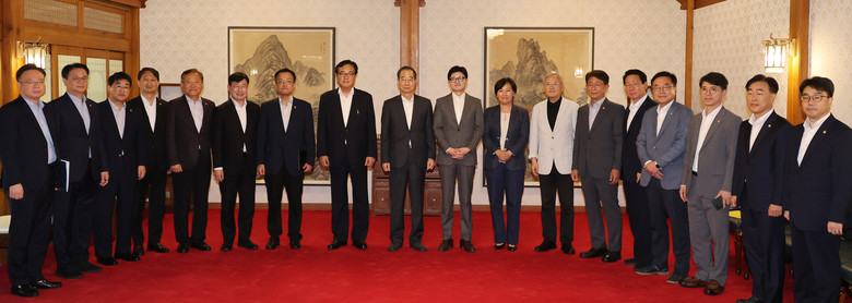 [세계타임즈 = 이채봉 기자] 한덕수 국무총리, 국민의힘 한동훈 대표, 정진석 대통령 비서실장 등이 25일 서울 종로구 삼청동 총리공관에서 열린 고위당정협의회 회의에 앞서 사진촬영을 하고 있다. 2024.8.25