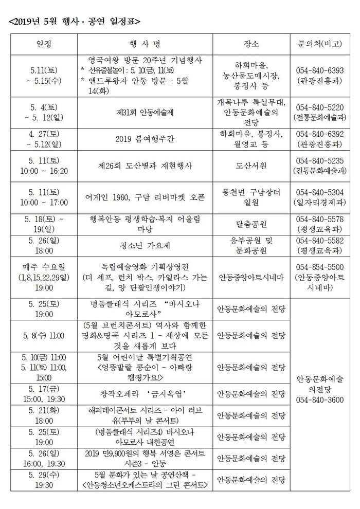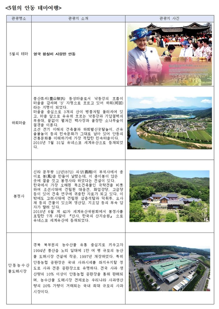 안동시에서는 5월 11일부터 15일까지, 여왕이 다녀간 하회마을과 봉정사, 안동농수산물도매시장 일대에서 영국 여왕 방문 20주년 기념행사를 개최한다. 4월 27일부터 계속된 ‘2019년 봄 여행 주간’의 대미를 장식하는 큰 볼거리다.