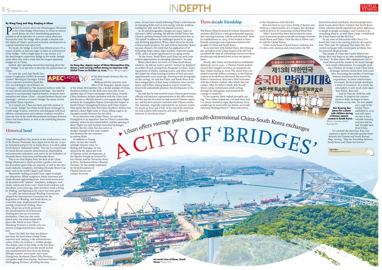 울산시에 따르면 환구시보는 지난달 31일자 신문(중국어·영문판 지면)에서 에이펙(APEC) 정상회의 심층(IN-DEPTH) 부문(섹션) 전면을 할애해 ‘다리의 도시(A CITY OF BRIDGES)’라는 제목으로 울산 특집 기사를 실었다.