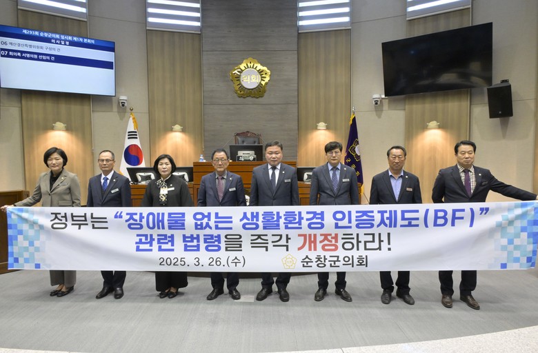 [순창 세계타임즈 = 박민서 기자] 순창군의회는 지난 26일 제293회 순창군의회 임시회 제1차 본회의에서 제도 본래의 취지를 살리고 주민 불편을 해소하기 위한 「장애물 없는 생활환경 인증(BF) 제도 개선 촉구 건의안」을 채택했다고 밝혔다.