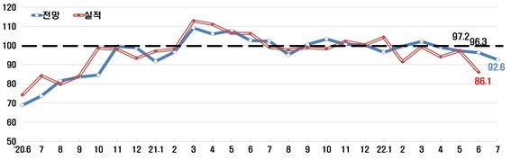 주1) 종합경기 BSI : 99.1(‘22.4월), 97.2(5월), 96.3(6월), 92.6(7월)
