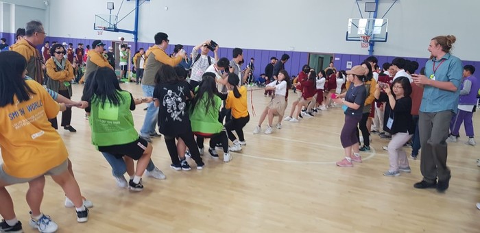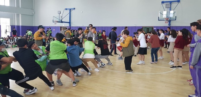 체육교류의 하이라이트는 줄다리기. 줄다리기를 하는 팀이나 응원하는 팀이 모두가 하나 되어 뜨거운 열기를 보여줬다. 줄다리기 결과는 남학생들은 중국 학생들이, 여학생들은 한국 학생들이 각각 승리했다. 그러나 무엇보다도 체육관이 떠나갈 정도의 응원을 보여주며 양국 학생들이 함께 우정을 나누는 모습이었다. 참석자 모두가 모여 사진 한컷을 촬칵. 그 열기를 남겨뒀다.