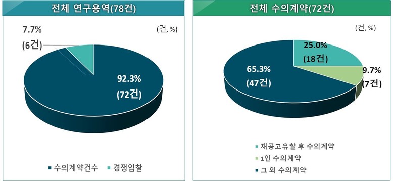 특히, 도교육청은 총 78건 중 72건(92.3%, 21억 8천여 만 원)을 수의계약 했고, 수의계약 건수 중 27건(37.5%, 11억 5천8백여 만 원)은 경남 외 지역업체들이 수주한 것으로 조사됐다.