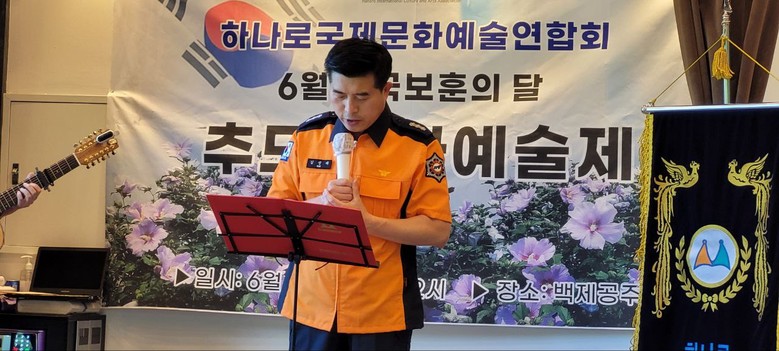 | ▲김성제 소방관이 하나로국제문화예술연합회에서 주최하는 추모문화예술제에서 자작수필을 낭독하고있다 |