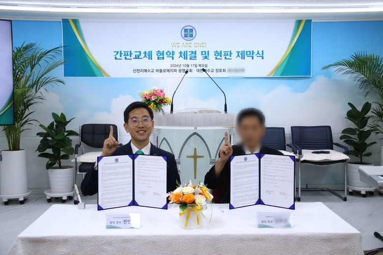 | ▲지난 17일 ‘협력교회로의 간판 교체 협약 체결 및 현판 제막식’이 진행되는 가운데 전민중 담임 강사(왼쪽)와 대한예수교장로회 김모 목사가 협약서를 들고 기념촬영 하는 모습 [사진 제공 = 신천지 광명교회] |