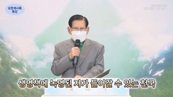 | ▲15일 신천지예수교회 이만희 총회장이 계시록 전반에 대해 설교하고 있다. ©신천지예수교회 공식 유튜브 |