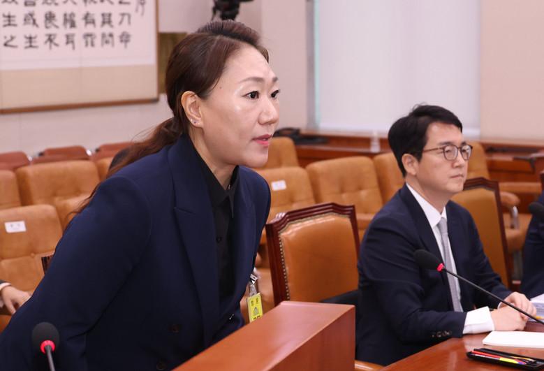 김건희 여사의 '공천개입 의혹'을 제기한 강혜경 씨가 21일 국회에서 열린 법제사법위원회의 대검찰청 대상 국정감사에 증인으로 출석, 의원들을 향해 인사하고 있다. 2024.10.21