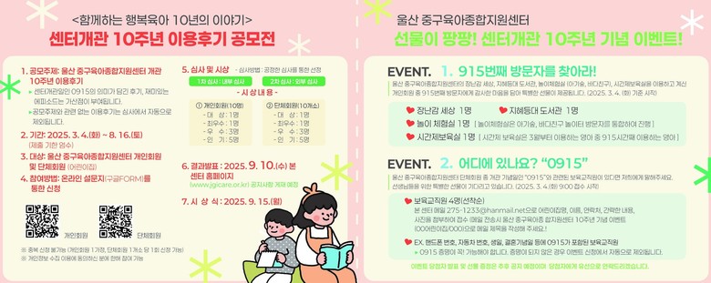 공모 주제는 울산 중구육아종합지원센터 이용 후기로, 개관일인 9월 15일과 관련된 사연과 재미있는 일화(에피소드) 등에는 가산점이 부여된다.
