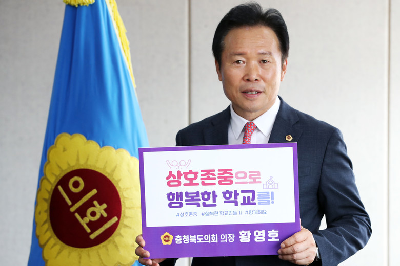 [충북 세계타임즈=이현진 기자] 충북도의회 황영호 의장은 12일 학생과 교사, 학부모가 상호 존중하는 행복한 학교 만들기 릴레이 캠페인에 참여했다.