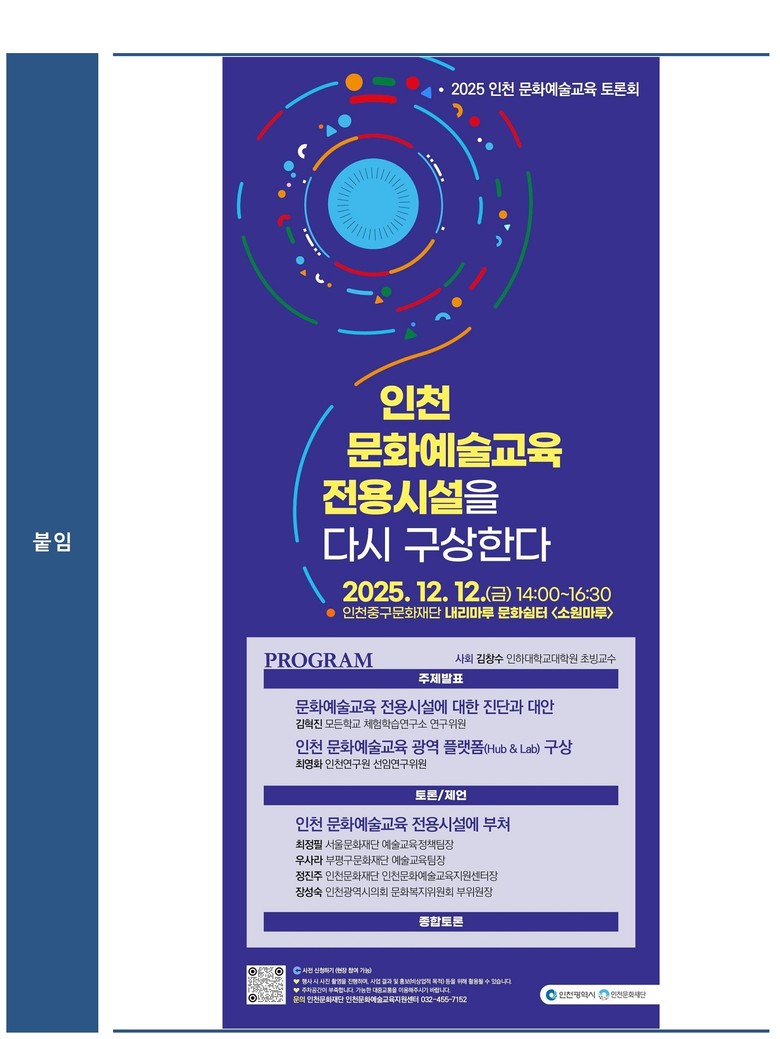 토론회에서는 김혁진 모든학교 체험학습연구소 연구위원이 ‘문화예술교육 전용시설에 대한 진단과 대안’을, 최영화 인천연구원 선임연구위원이 ‘인천 문화예술교육 광역 플랫폼 구상’을 주제로 발표한다. 이어 장성숙 인천광역시의회 문화복지위원회 부위원장, 최정필 서울문화재단 예술교육정책팀장, 우사라 부평구문화재단 예술교육팀장, 정진주 인천문화재단 인천문화예술교육지원센터장이 토론자로 참여하여 인천 문화예술교육 전용시설에 관한 다양한 제언을 나눌 예정이다.
