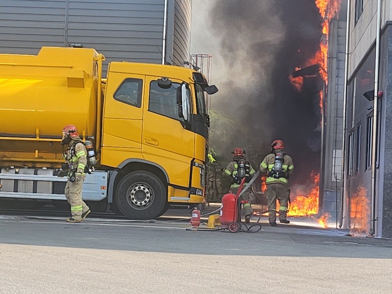 [아산 세계타임즈 = 이현진 기자] 17일 4시 4분께 충남 아산시 신창면 수장리의 한 폐유 정제 공장에서 불이 나 소방당국이 진화 작업을 벌이고 있다. 2024.8.17 [독자 제공]