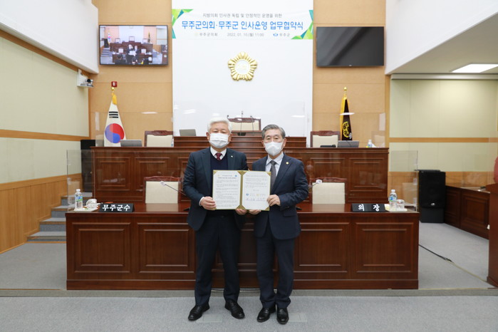 무주군의회와 무주군은 지난 10일 무주군의회 본회의장에서 업무협약식을 열고 인사교류와 교육훈련, 후생복지 등 인사 운영에 관한 교류협력을 명시하는 업무협약을 체결했다..